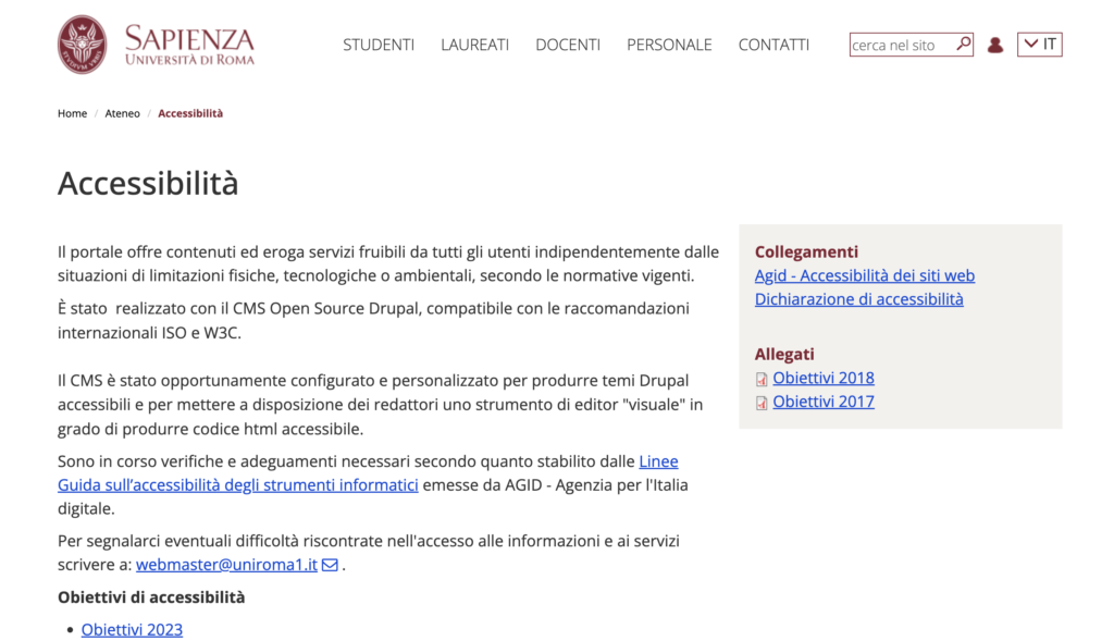 O la pagina ben strutturata dell’Università Sapienza in termini di accessibilità, in linea con i format AgID.