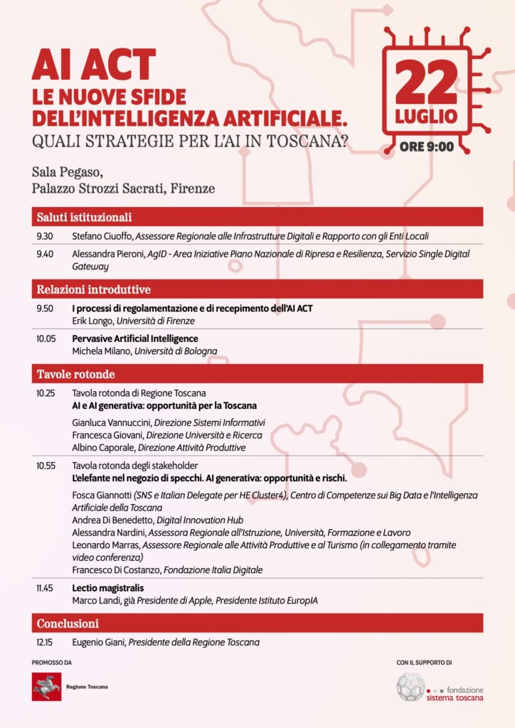 Marco Landi, già Vicepresidente di Apple e attualmente Presidente Institut EuropIA , parlerà del ruolo attuale dell’intelligenza artificiale e delle prospettive future. Tra i relatori anche Francesco Di Costanzo, presidente della Fondazione Italia Digitale. L’intervento conclusivo verrà svolto dal Presidente della Regione Toscana, Eugenio Giani.