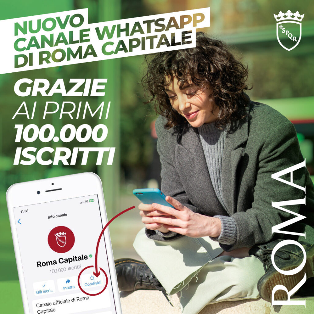 Superata la soglia dei 100mila iscritti: un successo per il canale WhatsApp di Roma Capitale – una delle prime città ad attivare il servizio rilasciato da Meta. I canali Whatsapp sono una nuova funzione del tutto diversa dalle liste broadcast (già in uso a molti Comuni), accessibile direttamente su smartphone o PC.  In questo modo vengono potenziati gli strumenti di comunicazione dedicati ai cittadini, lavoro iniziato con il nuovo sistema di informazione multicanale INFORoMA, a cui va ad aggiungersi il nuovo servizio WhatsApp per i cittadini.