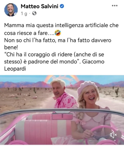 Adesso Salvini elogia l’intelligenza informativa. Ma come la prenderebbe se qualcuno utilizzasse la sua faccia per un video o una foto falsa dove non ha il fisico scultoreo di Ken-Ryan Gosling?