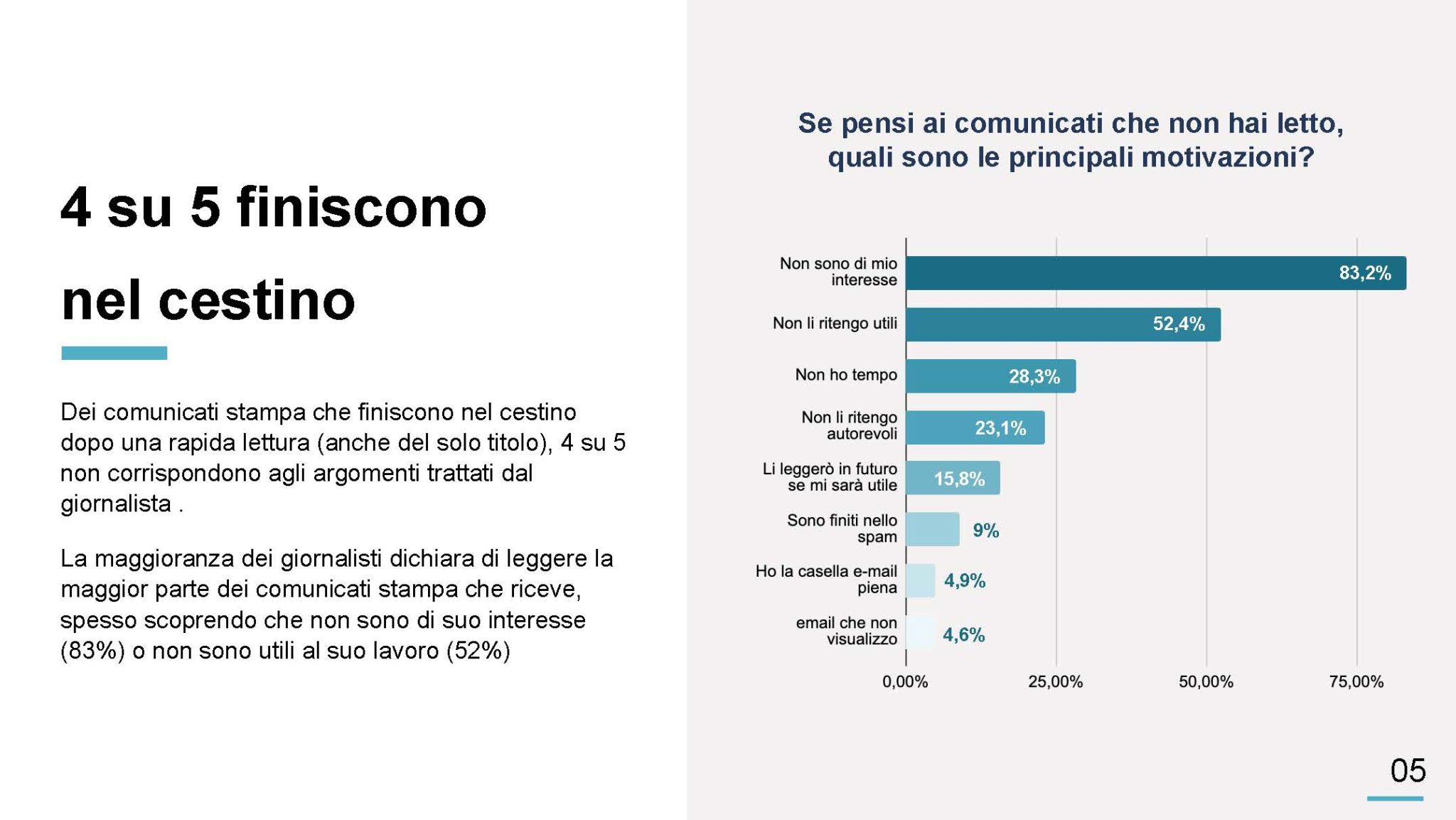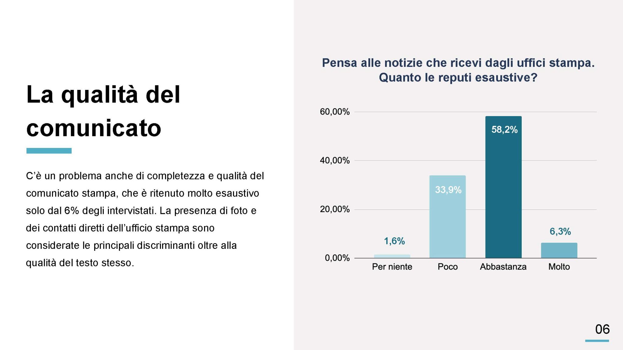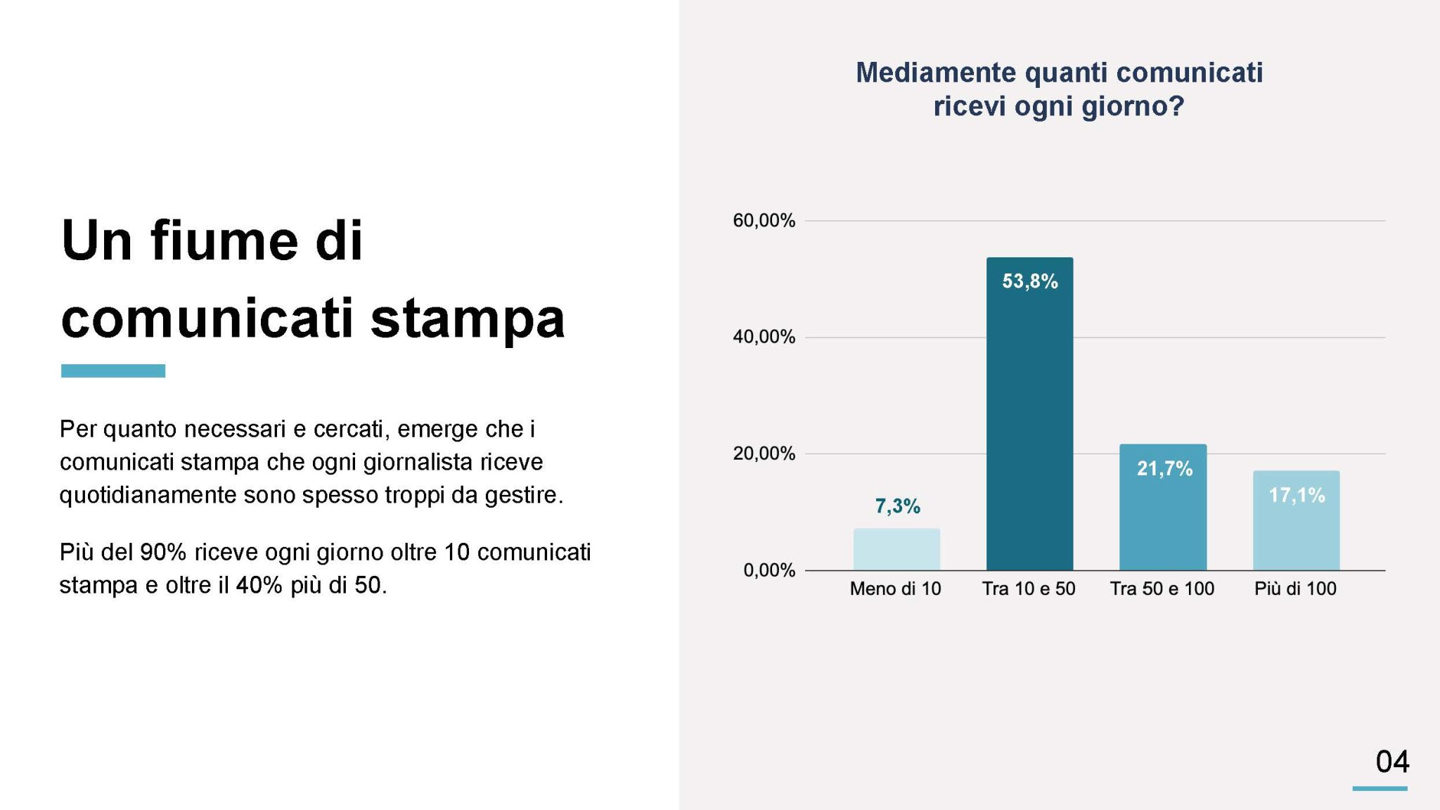 Il comunicato stampa rimane uno strumento fondamentale per i giornalisti che continuano a consultarli nonostante 4 comunicati su 5 si rivelino poco a fuoco o incompleti e finiscano spesso nel cestino. Da parte degli uffici stampa è necessario quindi capire meglio le esigenze dei giornalisti e cercare di raggiungere solo quelli interessati con un comunicato che risulti utile e completo. È quanto emerge dal reporto dell’Eco della Stampa in partnership con Mediaddress ha indagato il rapporto tra giornalisti e uffici stampa, un progetto che ha raccolto oltre 15.000 risposte da quasi 400 giornalisti.