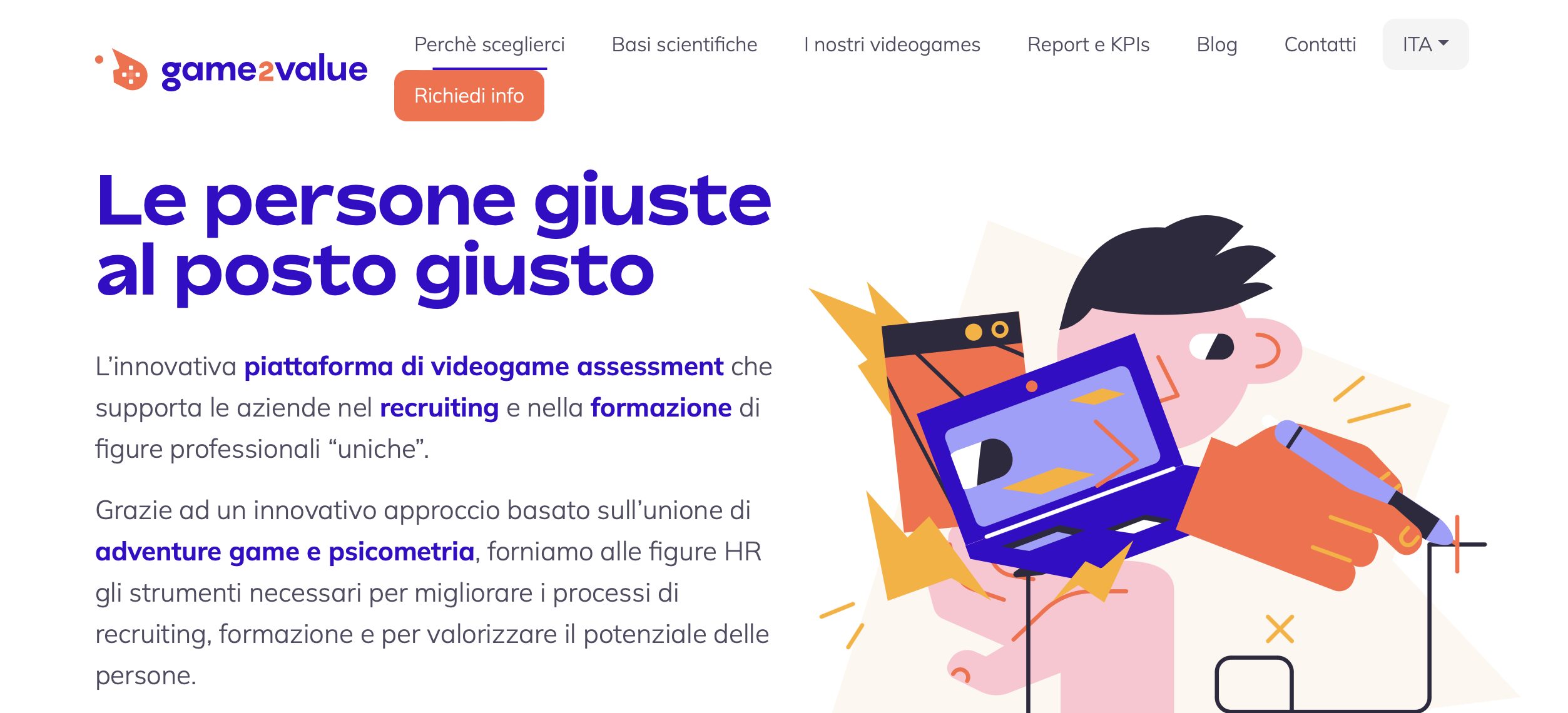 Valorizzare candidati e candidate, formare le risorse, coinvolgere i dipendenti intorno ai valori aziendali può essere una sfida complessa per gli HR manager alle prese con le ultime generazioni, che hanno abitudini di fruizione, informazione e interazione molto diverse rispetto ai decenni e le generazioni precedenti. Game2Value, nata a Milano dall’iniziativa di Gianmarco Pinto, prova a risolvere il mismatch tra vecchie tecniche di selezione e formazione e nuove generazioni di candidati e lavoratori, attraverso la prima piattaforma di videogame assessment in Italia che supporta le aziende nel recruiting e nella formazione delle figure professionali, attraverso un approccio basato sull’unione di adventure game epsicometria.