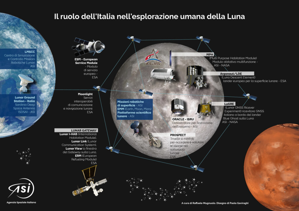 ll progetto HALO è un ulteriore capitolo dell’esplorazione lunare italiana, frutto della partecipazione ai principali programmi spaziali internazionali, in particolare attraverso l’Agenzia Spaziale Italiana. Un grande elemento centrale di questa strategia è la partecipazione al programma Artemis della NASA, che riporterà l’uomo sulla Luna. L’Italia contribuisce allo sviluppo del Modular Permanent Habitat (MPH), un modulo abitativo multifunzionale progettato per fornire agli astronauti un ambiente sicuro e funzionale. Un altro programma di rilievo è ESA Moonlight, dedicato alla creazione di servizi di navigazione e comunicazione per l’esplorazione lunare, a cui ASI partecipa attivamente. Inoltre, in collaborazione con la NASA, l’Italia è coinvolta nella missione LuGRE, che prevede lo sviluppo di un sistema avanzato di navigazione GNSS per le future missioni lunari. Infine a Torino, presso ALTEC, è operativo il Centro di Simulazione e Controllo delle Missioni Robotiche Lunari (LMSCC), un’infrastruttura strategica che supporta la gestione delle missioni robotiche sulla Luna, consolidando il ruolo dell’Italia nella preparazione all’esplorazione spaziale umana.