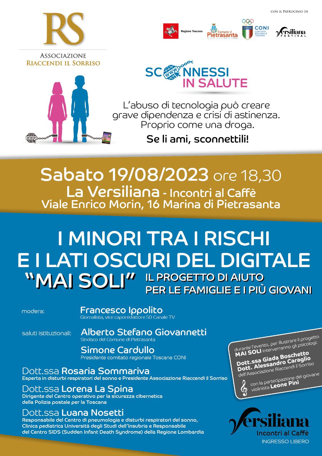 Quali sono i rischi che derivano dall’uso scorretto e dall’abuso dei dispositivi digitali? Se ne parla domani sabato 19 agosto alle ore 18.30 al Caffè della Versiliana di Marina di Pietrasanta. Un’occasione di approfondimento e di confronto per i genitori, ma non solo, anche per insegnanti, educatori, insomma chiunque abbia a che fare con il futuro delle ragazze e dei ragazzi.