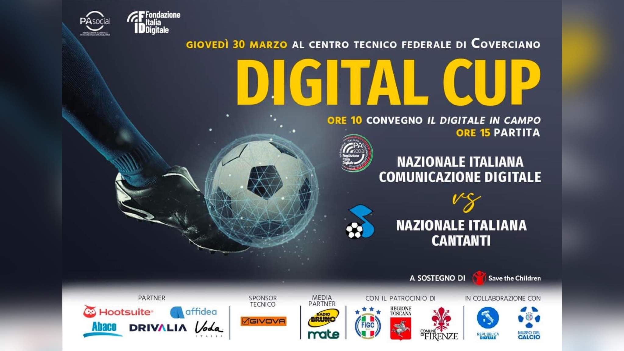 Unire lo sport con la cultura e la divulgazione del digitale. Questo l’obiettivo della prima edizione della Digital Cup 2023, L’iniziativa, nata dalla sinergia tra PA Social e Fondazione Italia Digitale, vedrà come protagonisti la Nazionale Italiana Comunicazione Digitale e la Nazionale Italiana Cantanti. Tutti in campo il 30 marzo, dalle 10,00 al Centro Tecnico Federale di Coverciano, in Via Gabriele D’Annunzio, 138, (Firenze).