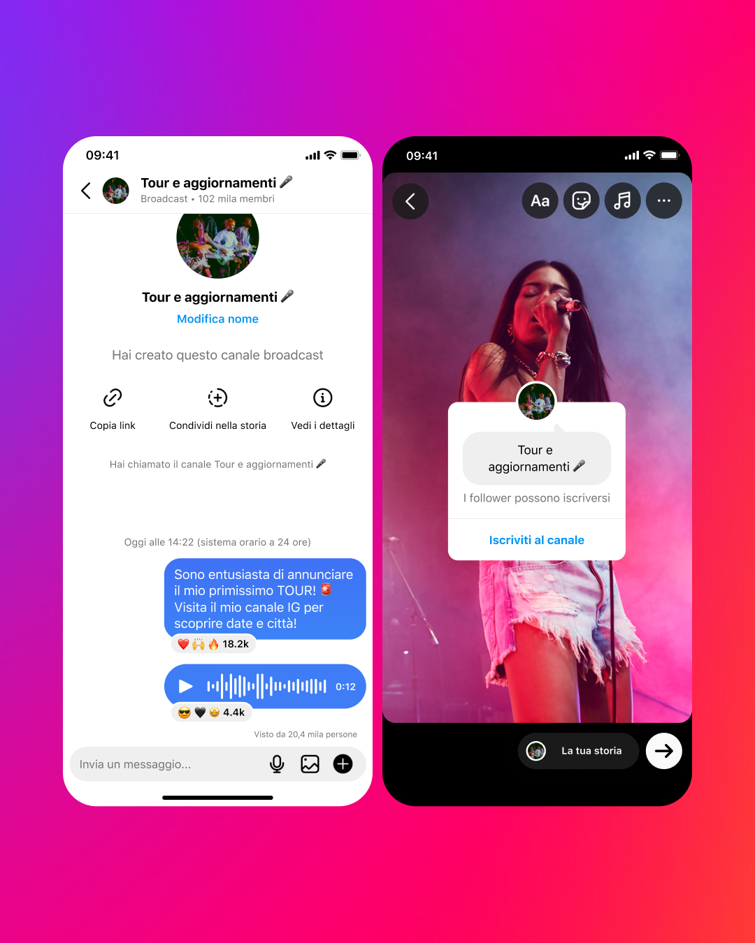 Ieri, 15 giugno, Mark Zuckerberg ha annunciato l’arrivo dei Canali Broadcast di Instagram in tutto il mondo, offrendo a un maggior numero di creator la possibilità di interagire con i propri follower in modo più approfondito su argomenti e contenuti specifici. Sin dalla prima fase di test negli Stati Uniti a febbraio, i Canali Broadcast sono diventati un nuovo modo per i creator di condividere e creare contenuti che coinvolgano direttamente i loro follower. Molti creator di rilievo hanno utilizzato i canali per condividere contenuti behind the scenes, chiedere feedback nei sondaggi, o pubblicare aggiornamenti quotidiani. Con l’arrivo dei Canali Broadcast a livello globale, saranno disponibili anche nuove funzionalità che i creator potranno utilizzare per interagire con i fan in modo più dinamico e divertente, tra cui: