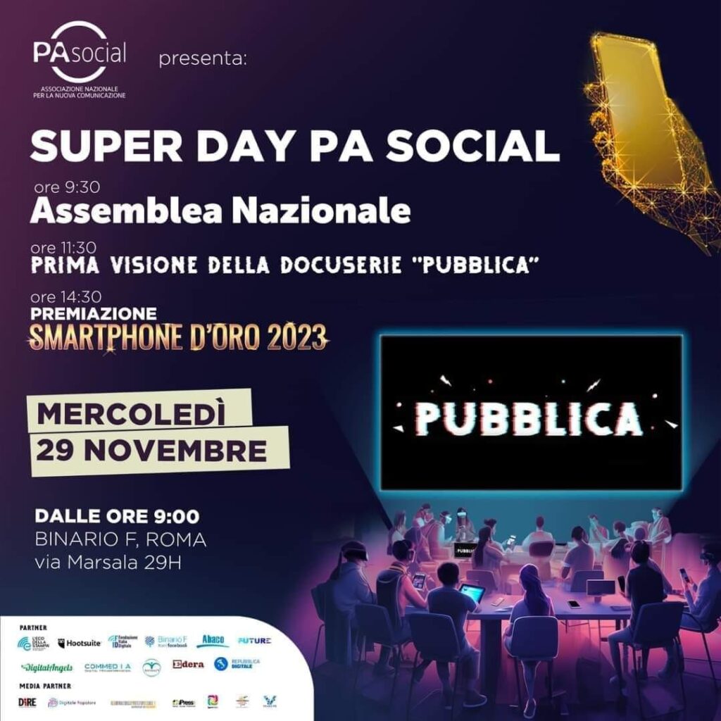 È oggi il grande giorno dell’evento dedicato alla comunicazione pubblica digitale che per l’edizione 2023 cresce e si fa in tre. Tutto pronto per il Super Day PA Social, organizzato dall’associazione PA Social, la prima in Italia dedicata alla comunicazione e informazione digitale. Oggi a Binario F (via Marsala 29H, c/o Hub LVenture Group e LUISS Enlabs) a Roma, a partire dalle ore 9 e per l’intera giornata, esperti di comunicazione e informazione digitale, giornalisti, comunicatori, social media manager, istituzioni, imprese di tutta Italia si danno appuntamento per un evento unico che si dividerà in più momenti. Il primo sarà dedicato all’assemblea nazionale annuale dell’associazione, occasione di confronto che nasce con l’obiettivo di fare il punto su quanto fatto fino a questo momento e allo stesso tempo programmare le attività del prossimo anno. Il secondo è una prima visione assoluta: si tratta della proiezione della prima docuserie italiana dedicata alla comunicazione e informazione pubblica digitale “Pubblica”, prodotta da PA Social in collaborazione con Binario F, Edera, Fondazione Italia Digitale. L’obiettivo del progetto è quello di raccontare, con un linguaggio diretto e semplice, come il digitale abbia cambiato le nostre abitudini, presentare i nuovi strumenti digitali e sottolineare l’esigenza di educare e formare all’utilizzo del digitale stesso. Il terzo sarà dedicato alla cerimonia di premiazione dello Smartphone d’Oro, riconoscimento rivolto alle migliori esperienze di comunicazione e informazione pubblica digitale, che quest’anno ha battuto il record di candidature con 91 prodotti di comunicazione presentati da PA, utilities, enti e aziende di servizio pubblico.