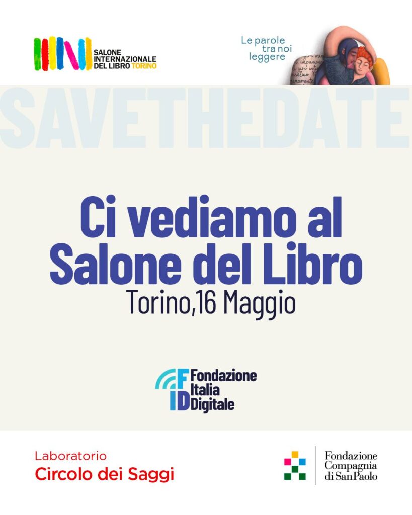 Fondazione Italia Digitale approda al Salone Internazionale del Libro di Torino 2025. FID sarà protagonista di un’intera giornata di eventi, talk e incontri in programma per il 16 maggio all’interno del Laboratorio Circolo dei Saggi, in collaborazione con la Fondazione Compagnia di San Paolo.