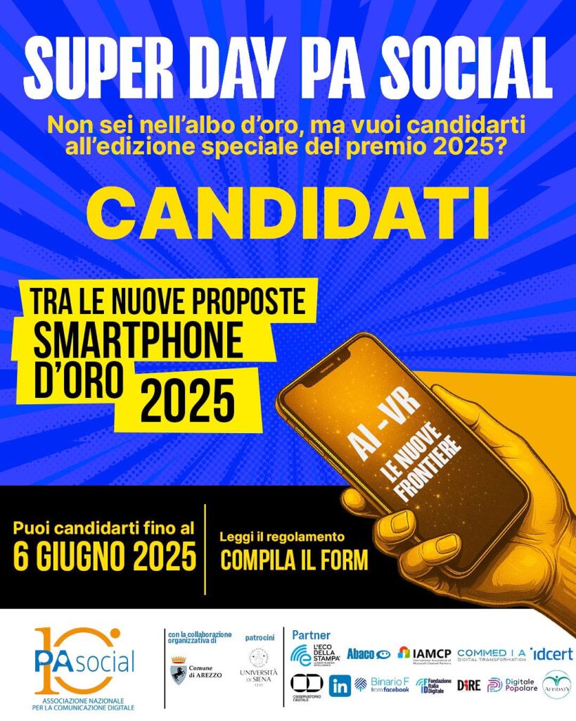 In occasione del suo decimo anniversario, PA Social celebra un traguardo importante rilanciando il proprio premio simbolo con un’edizione speciale e ricca di significato: nasce il Super Smartphone d’Oro – Edizione 2025 “Il migliore dei migliori”, all’interno dell’evento nazionale Super Day, in programma giovedì 19 giugno ad Arezzo, presso le Logge del Grano, dalle ore 9 alle 18.
