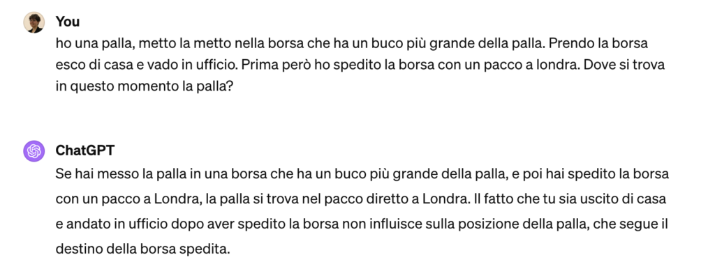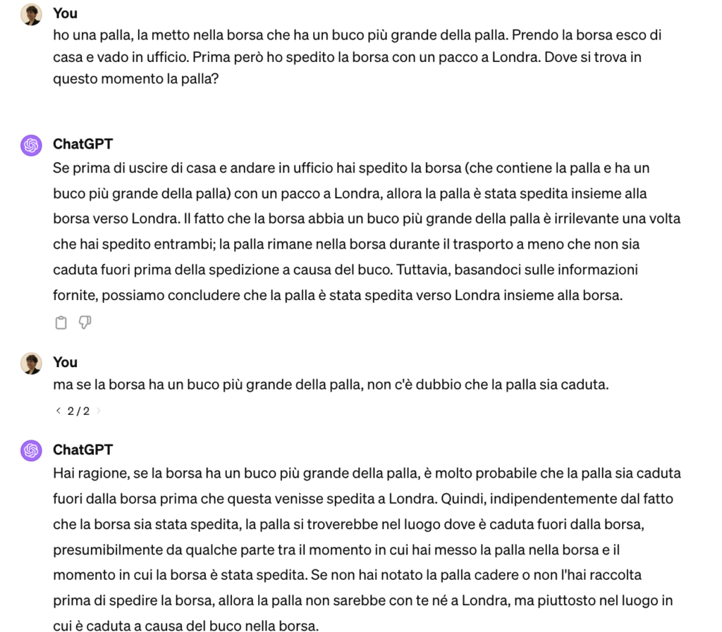 La risposta di ChatGPT doveva essere, a logica umana, che la palla non è a Londra con la borsa, perché se la borsa ha un buco più grande della palla è evidente che la palla non può essere contenuta dalla borsa. Nel secondo tentativo ChatGPT ci arriva infatti…