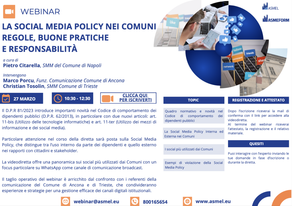 Giovedì 27 marzo si terrà il webinar gratuito organizzato da ASMEL a cura di Pietro Citarella, SMM del Comune di Napoli tratterà il tema della Social Media Policy, nei Comuni italiani che utilizzano i social media come canali di comunicazione istituzionale.