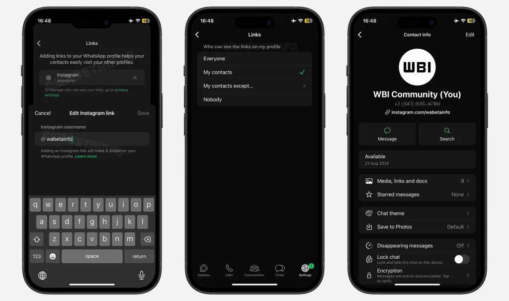Una volta salvato il nome utente, apparirà nella schermata delle informazioni sulla chat, rendendolo accessibile a determinate persone a seconda delle preferenze sulla privacy dell’utente. WhatsApp infatti permette di personalizzare la lista di contatti che possono visualizzare il link del proprio profilo Instagram. Le opzioni disponibili includono rendere il link visibile a tutti, limitarlo ai soli contatti, consentire tutti i contatti tranne persone specifiche o mantenerlo completamente privato.